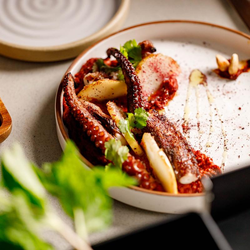 Grilled octopus, romesco sauce, pear, and marcona almonds.